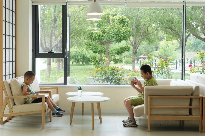 8月9日,小朋友在河北省石家莊市鹿泉區龍泉湖公園內一處公園書房閱讀。