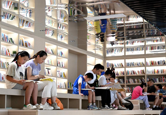 8月9日,市民在河北省石家莊市鹿泉區龍泉湖公園內一處公園書房閱讀。