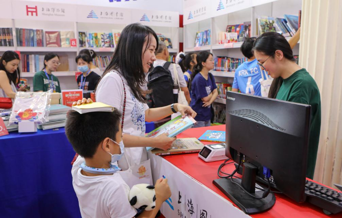 8月16日,讀者在上海圖書館展位現場借閱書籍。