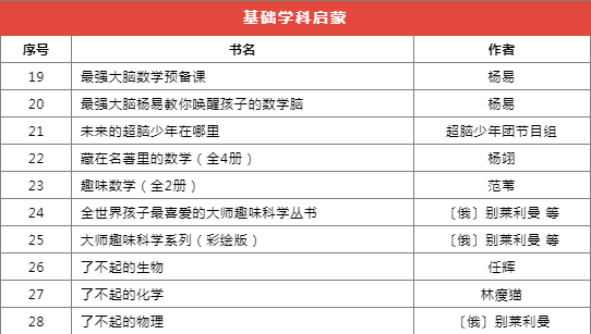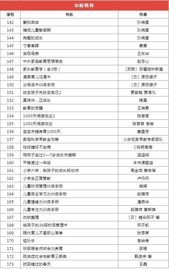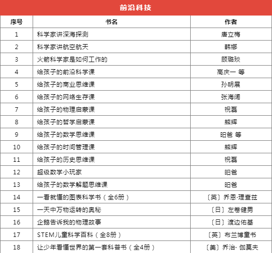 推薦書目種類繁多,分為前沿科技、基礎(chǔ)學科啟蒙、自然科學、家庭教育等十個類別,共計173本(套)。