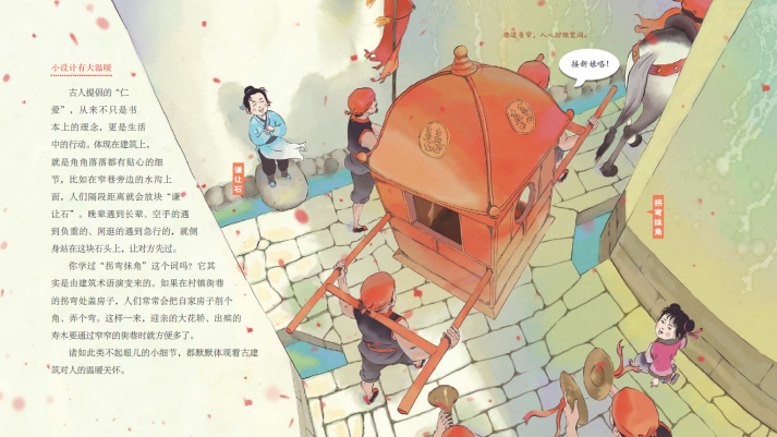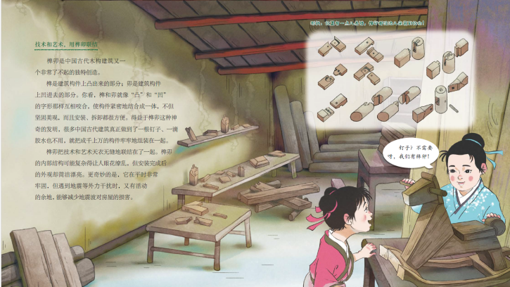 書中提到了在墻面削個角、弄個彎,“拐彎抹角”、方便大家行走的謙讓智慧;齊心協力,共同出資出力蓋房子的和諧智慧;技術和藝術并存,用榫卯聯結構件的建構智慧;防患于未然,保證人們生命、生活安全的防患智慧……