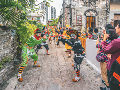 2023年11月12日,第八屆嶺南民俗文化節下基層演出在三溪舉行。圖為來自廣東普寧的英歌舞展演,引來群眾不斷喝彩。鄭建邦攝