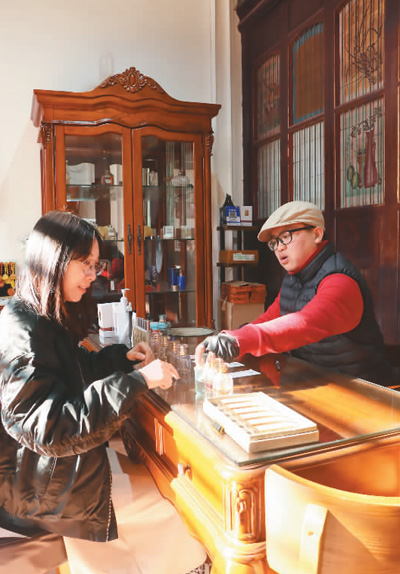 香水店主歐毓光在為游客試香。記者 康 樸攝