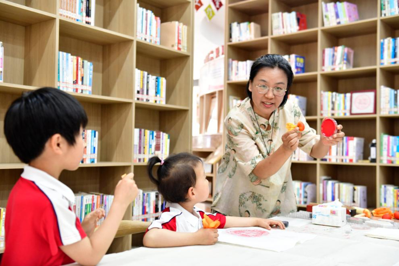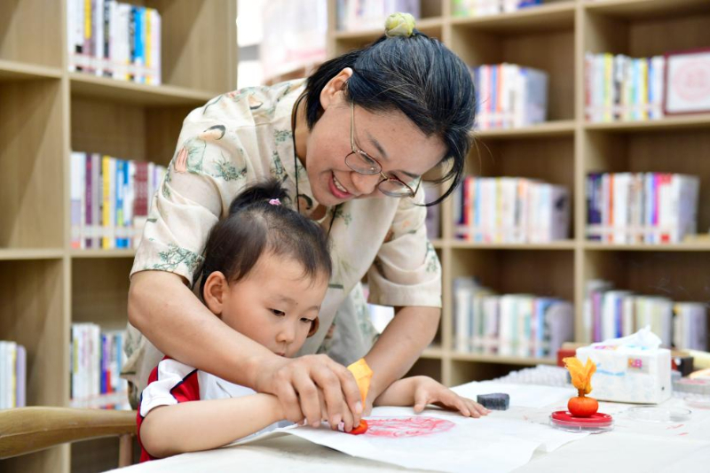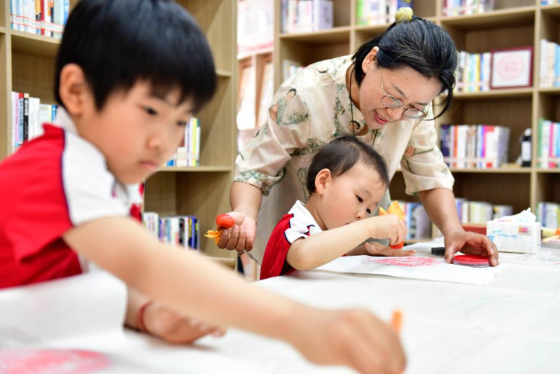5月23日,在日照市東港區城市書房石臼所館,志愿者在教孩子拓印。