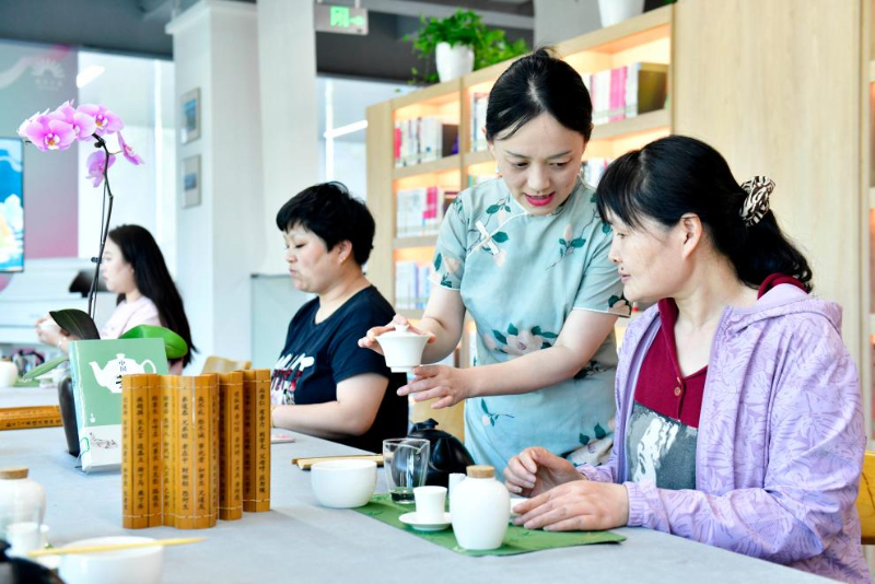 5月23日,在日照市東港區城市書房櫻花園館,茶藝師張娜(右二)教市民茶藝。
