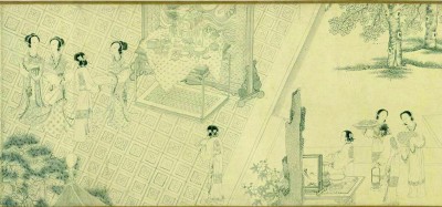 明代仇英《乞巧圖》(局部,臺北故宮博物院藏),表現的是在庭院中陳設幾筵、瓜果祭祀牛女的場景