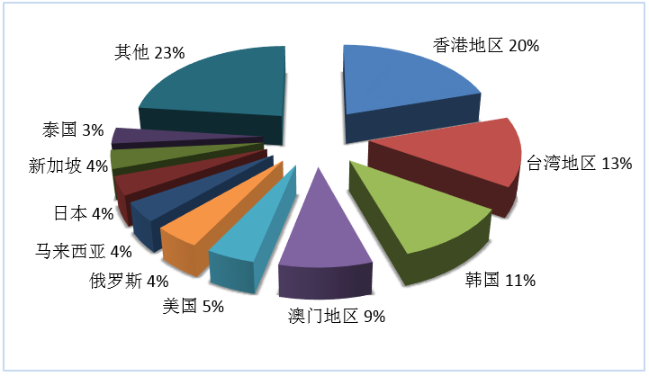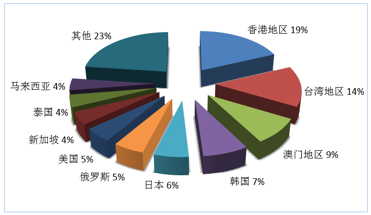 第三季度旅行社入境旅游外聯(lián)人次排名前十位的客源地國家或地區(qū)由高到低依次為香港地區(qū)、臺(tái)灣地區(qū)、澳門地區(qū)、韓國、日本、俄羅斯、美國、新加坡、泰國、馬來西亞(見圖1)。