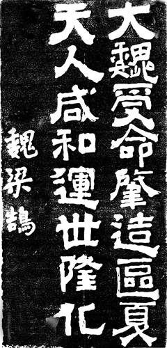 他的書法作品中,具有代表性的是一幅“大魏受命,肇造區(qū)夏,天人咸和,運世隆化”的字。這幅字今人能看到拓片。人們評價說:書跡骨氣凝重,筋力豐足,筆勢雄健,意志戇宕。