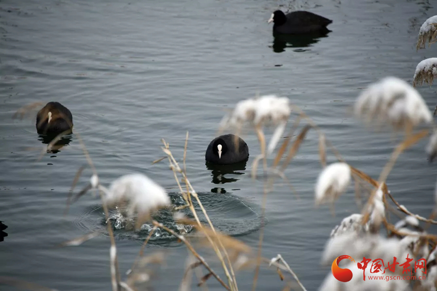 黑白相間的珍禽點綴尚未結(jié)冰的湖面