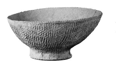 甘肅省博物館展出的一只大碗,和牛肉面大碗基本一樣。造型完全相同:圓口,口大而底小,大約一指頭寬的碗底,人們稱之為碗足。從碗足開始,逐漸擴展,直到碗口。不同的是,這只八千年前的碗上有大量的繩紋,是用夾砂陶燒制而成的。