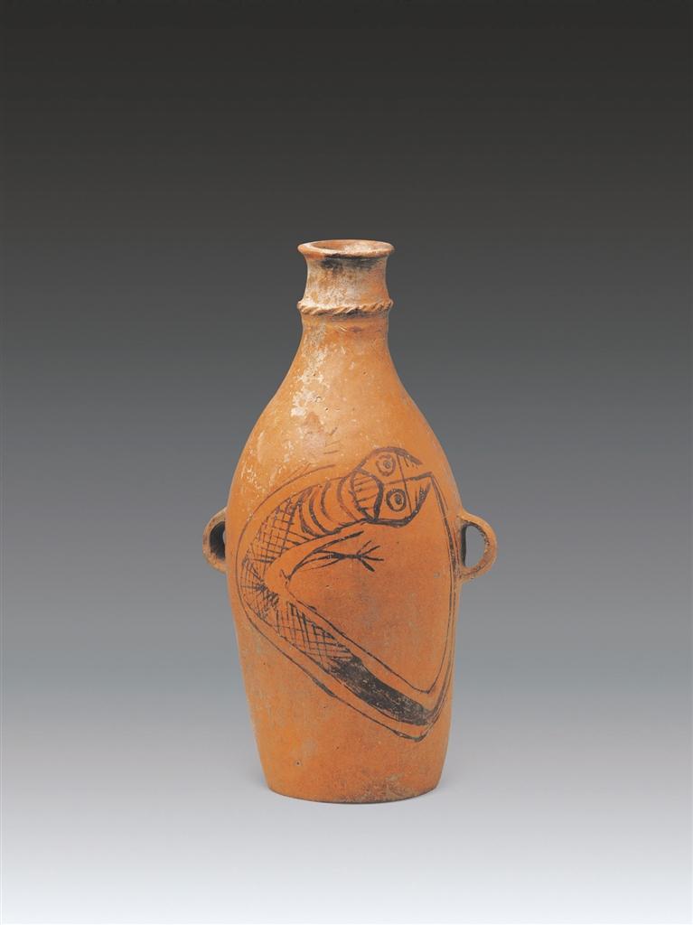“鯢魚紋彩陶瓶”(距今約 5200 年),這是只工藝非常精美的彩陶瓶,式樣與后世的瓶一般無二了。更令人贊嘆的是勻稱凈美的瓶身上繪的一只娃娃魚,也就是學名鯢魚的彩繪! 這只娃娃魚雙目圓睜,大口露牙,長條曲折狀身軀,首尾相接,兩側飾爪形紋。彩陶瓶上的娃娃魚圖案繪得如此生動傳神,給這件精美的彩陶瓶平添了許多神秘意境和藝術魅力。