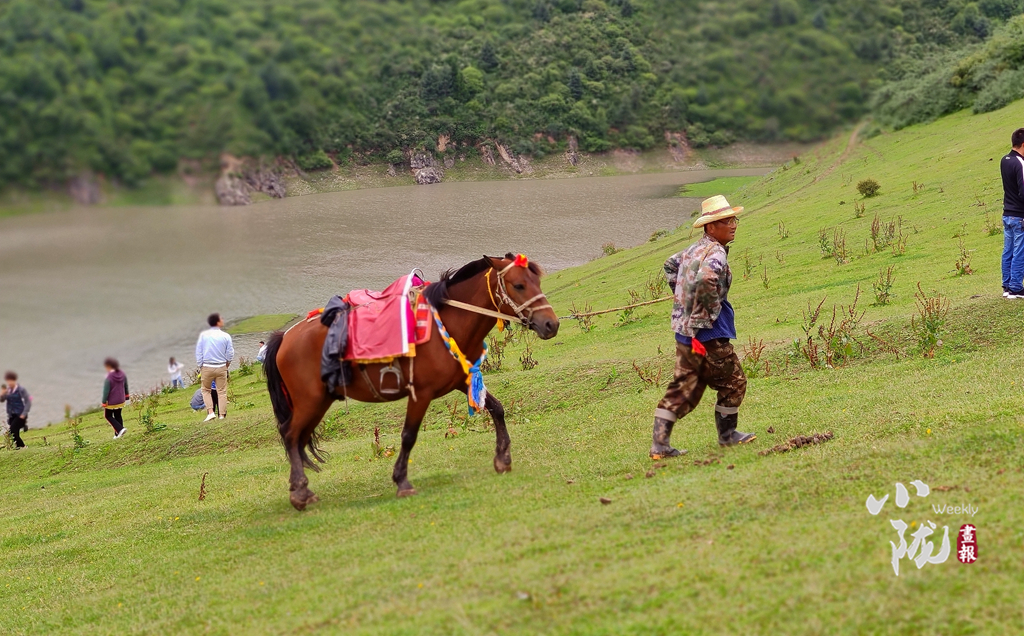 湖的東西兩側(cè)聳立著廟花山和臨潭最高峰白石山,環(huán)湖山坡芳草萋萋,水映山廓,山水云天渾然一體。