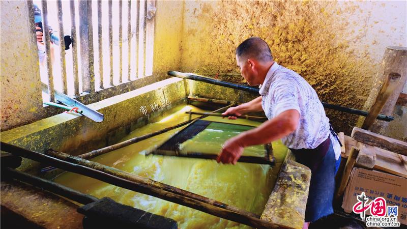 隆回縣灘頭鎮桃林村手工抄紙作坊,已經成為一處著名的文旅項目景點。走進陶林村,一棟棟青瓦石墻的新屋吸引了人們的目光。屋外山坡竹林茂密,山溪流水潺潺,屋內手工抄紙制作的原料、工具布置的次序井然,手工抄紙的全套工藝流程在這幾棟屋中得以完整體現。手工抄紙技術歷史悠久,始于隋唐,至明朝時抄紙已經非常盛行。上世紀八十年代鼎盛時還曾遠銷東南亞和日本。非遺傳承人李志軍今年61歲,自稱“紙蟲”,帶領著全家人承襲著祖宗留下的獨特技藝。而支撐著李志軍的堅守的,是隆回縣文旅部門的巨大付出和努力。2011年,他們支持李志軍建立了手工抄紙標準化作坊,2016年又對該作坊進行擴建,使之成為國家級非遺項目。灘頭手工抄紙作坊占地面積1714平方米,是灘頭手工抄紙有史以來最大的作坊,同時也是集生產、創新、傳承、展示、研學為一體的重要基地和文旅基地。