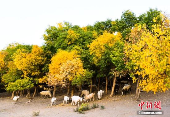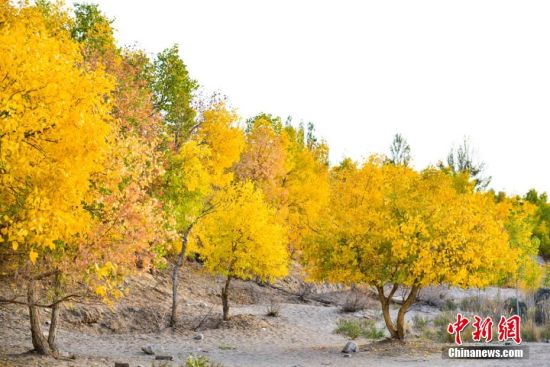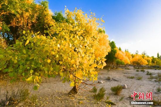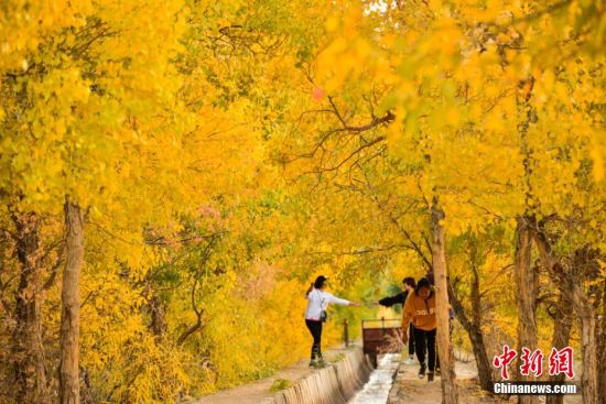 秋風(fēng)漸涼,秋色漸濃,地處絲綢之路黃金旅游段的甘肅敦煌,大漠戈壁上地勢低洼的地方或有河流經(jīng)過的地方,都會有大片大片的原始胡楊林,用金黃色璀璨奪目的色彩展示醉人的秋意,一輛輛車停靠在路邊,三五成群的游客徒步前往戈壁深處觀賞醉人的胡楊秋色。王斌銀 攝