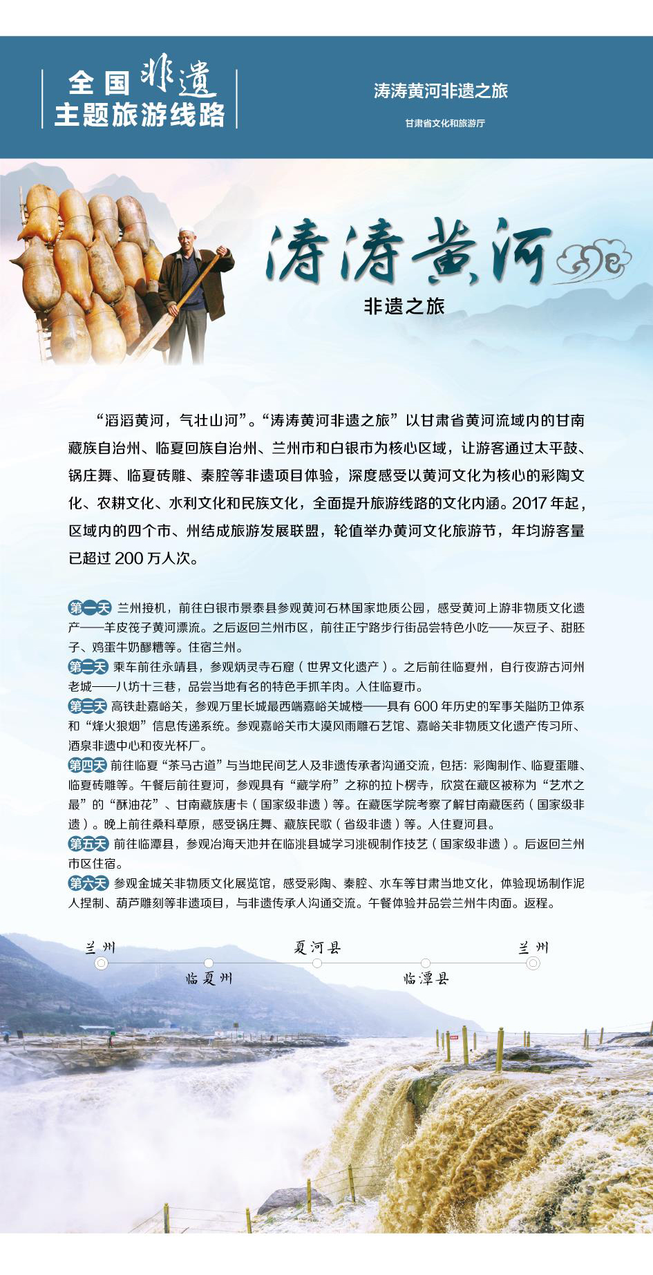 中國甘肅網10月19日訊 (本網記者 張蘭琴)10月18日,在貴州舉辦的“中國丹寨非遺周”活動期間,文旅部首次發布了“全國非遺主題旅游線路征集宣傳活動”入選線路名單。由甘肅省文旅廳組織選送的“交響絲路非遺之旅”和“濤濤黃河非遺之旅”2條非遺主題旅游線路同時入選,我省成為全國唯一入選兩條線路的省份。