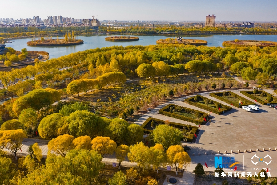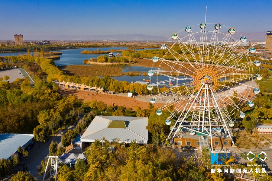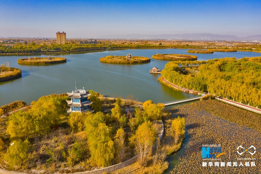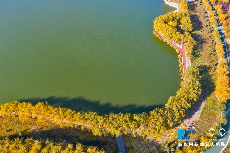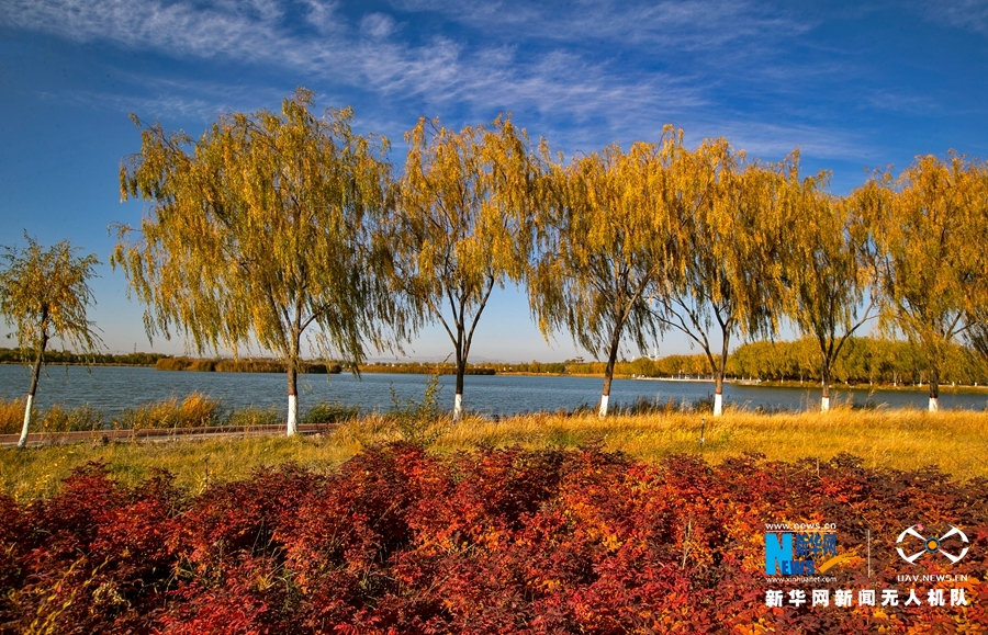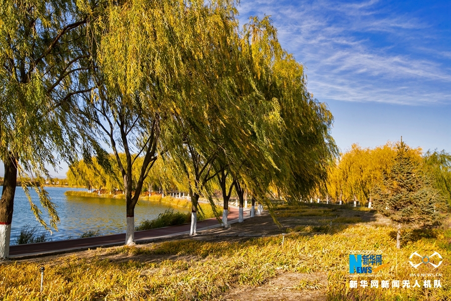 深秋時節,國家4A級景區甘肅省張掖潤泉湖公園秋水依依,草木金黃,呈現出一幅斑斕畫卷。新華網發(成林 攝)