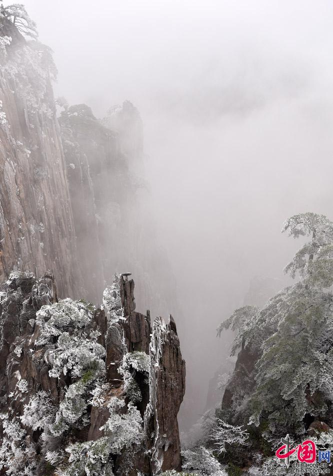 陽春三月應是百花盛開的時節,3月21日,在黃山風景區卻出現大面積的霧凇景觀,“一夜寒風起,萬樹梨花開”,溝壑峰巒間宛如披上了潔白的盛裝將人們帶入玉樹瓊花的世界,于是來到黃山的游客在感受驚嘆之余紛紛用相機、手機拍照留念,并用各種傳播方式分享給親朋好友。(姚育青 攝)