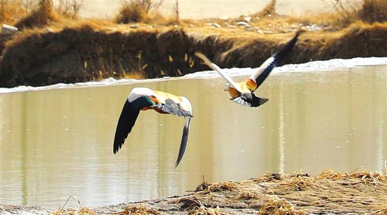 3月下旬,在武威市天祝縣華藏寺鎮金強河邊,到處都有赤麻鴨和白鷺的身影。它們或自由游弋,或盤旋飛翔……