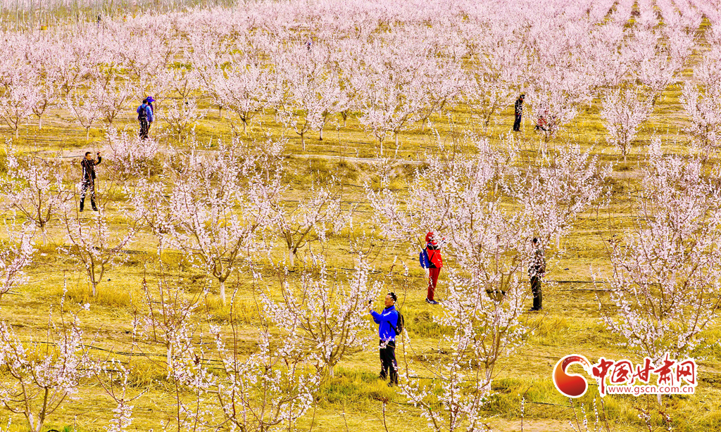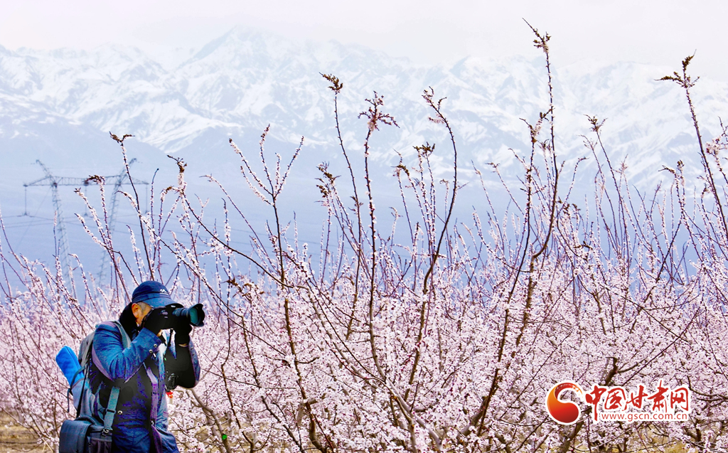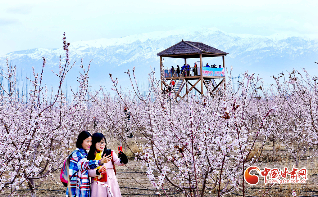 4月3日,游客在祁連山下的甘肅張掖甘州區金滿園千畝杏園種植基地里賞花和拍照留念。