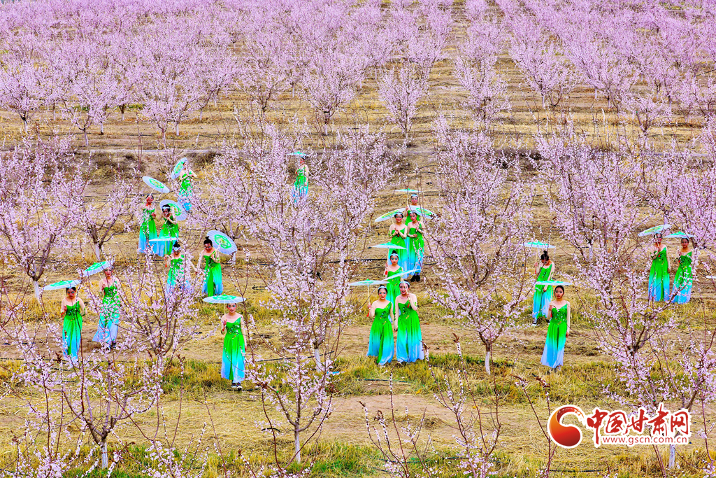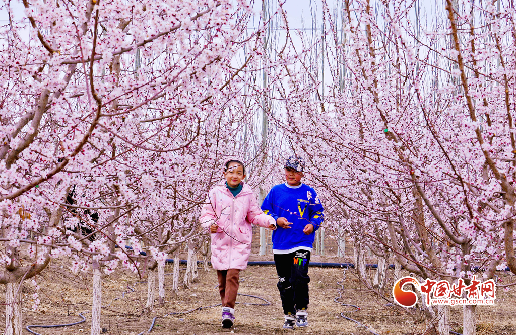 4月3日,小朋友在甘肅張掖甘州區金滿園千畝杏園種植基地杏花園里跳起了《春之舞》。