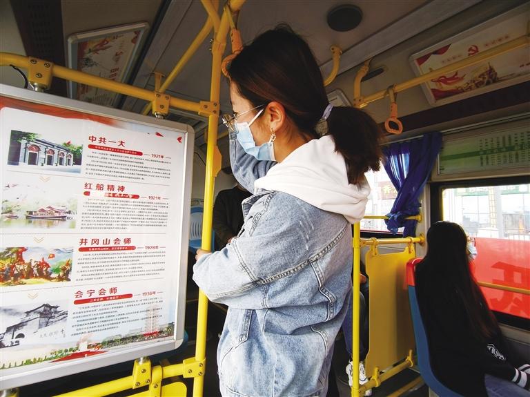 黨史學習教育主題車廂的車體外部掛有醒目的黨史宣傳標語,走進車廂,風道展板上以黨史故事的形式,圖文并茂、生動形象地展示著紅船精神、井岡山精神、長征精神、遵義會議精神、延安精神、西柏坡精神、抗美援朝精神、戰疫精神等內容。車廂內的座椅靠背、宣傳欄等處也印有不同的黨史宣傳知識,公交車廂成了黨史學習教育的流動“微課堂”。乘坐在黨史學習教育主題公交車上,乘客便可重溫中國共產黨波瀾壯闊的輝煌歷程,汲取民族復興的精神力量。