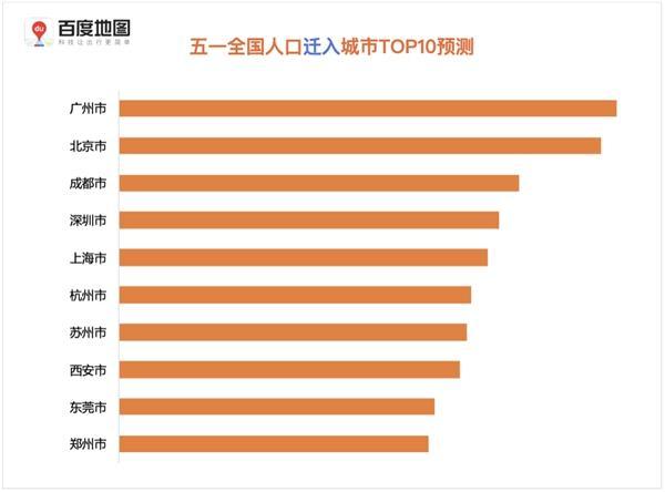 在熱門遷徙城市方面,全國人口遷徙規模TOP10的城市仍將集中在 線、新 線城市。其中,一線城市北京、上海、廣州、深圳和新一線城市成都,預計將占據五一假期熱門遷入、遷出城市前五的位置,而杭州、蘇州、西安、東莞、鄭州、武漢等城市也位列榜單前十。