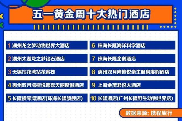 數據顯示,攜程酒店預訂間夜以及GMV在假期前三天連續突破平臺歷史峰值,對比2019年同期,單日訂單量增幅最高達70%。湖州龍之夢動物世界大酒店、湖州太湖龍之夢鉆石酒店、無錫拈花灣拈花客棧、惠州雙月灣檀悅都喜天麗度假酒店、長隆橫琴灣酒店(珠海長隆旗艦店)、珠海長隆海洋科學酒店、珠海長隆企鵝酒店、惠州雙月灣檀悅豪生溫泉度假酒店、上海金茂君悅大酒店、長隆酒店(廣州長隆野生動物世界店)為今年“五一”黃金周熱門酒店TOP10。