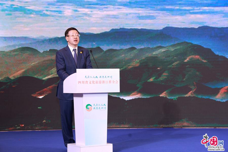 杭州五月,西子湖畔。為感謝浙江對四川的東西部協作和對口支援,5月19日,由四川省人民政府主辦,四川省文化和旅游廳、四川省經濟合作局、四川省人民政府駐上海辦事處聯合承辦的“天府三九大·安逸走四川”四川省文化旅游浙江推介會在浙江杭州舉行。四川省人民政府副省長羅強、浙江省人民政府副省長成岳沖出席推介會并致辭。