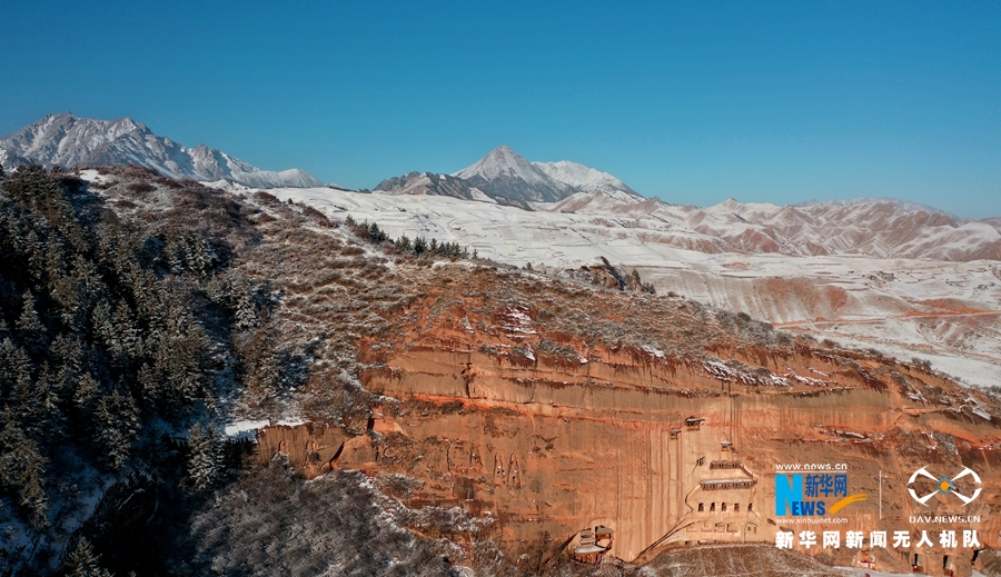 當日,雪霽初晴的甘肅省張掖市肅南裕固族自治縣馬蹄寺風景區,松海翠柏銀裝素裹,與丹霞峭壁上的石窟相互映襯,如一幅美麗畫卷。