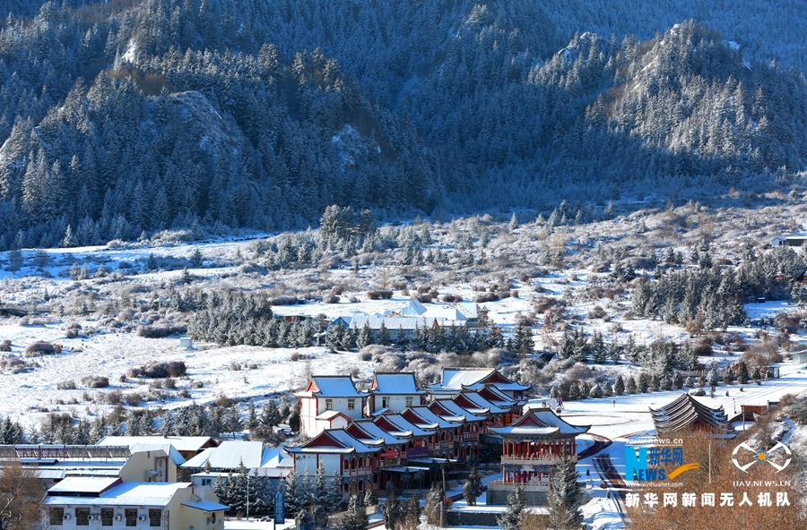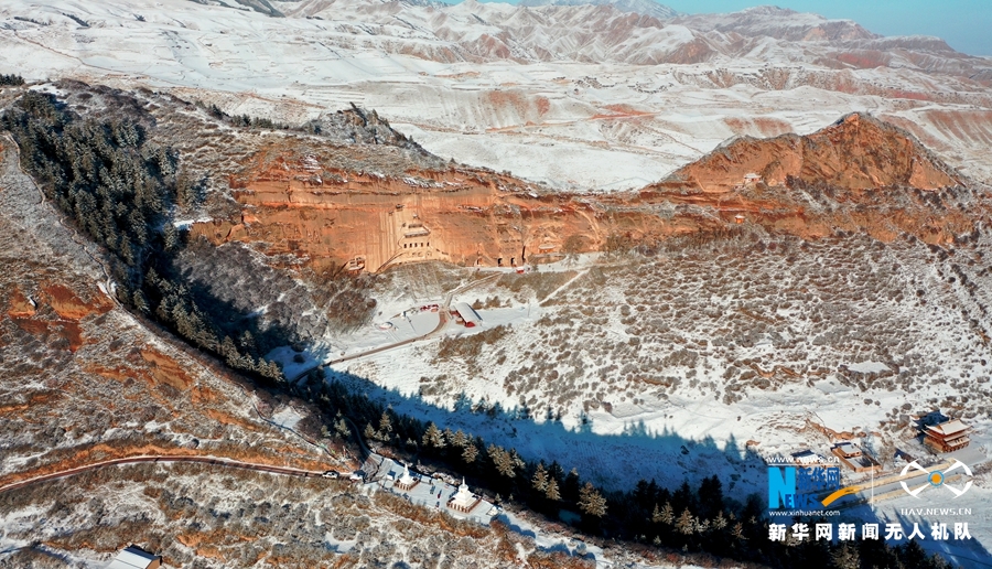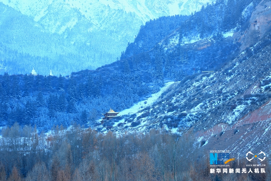 這是11月21日航拍的甘肅省張掖市肅南裕固族自治縣馬蹄寺風景區雪景。新華網發(楊永偉 攝)
