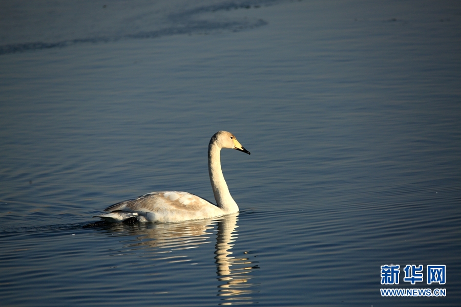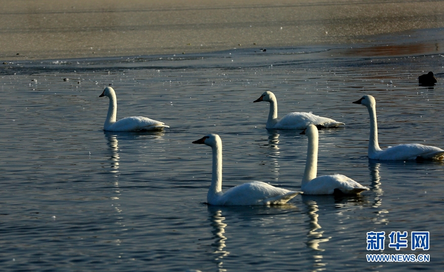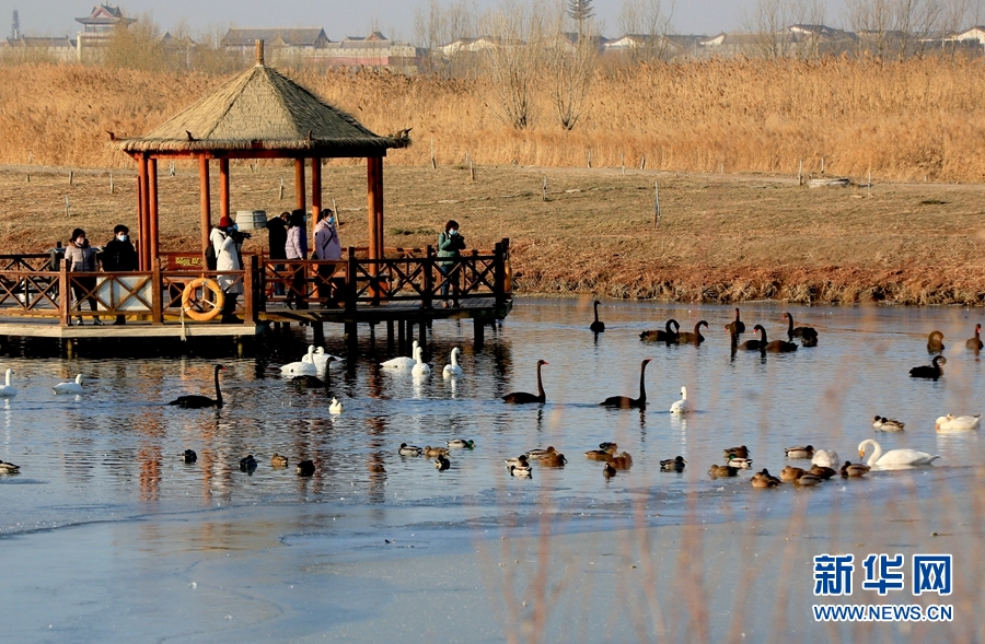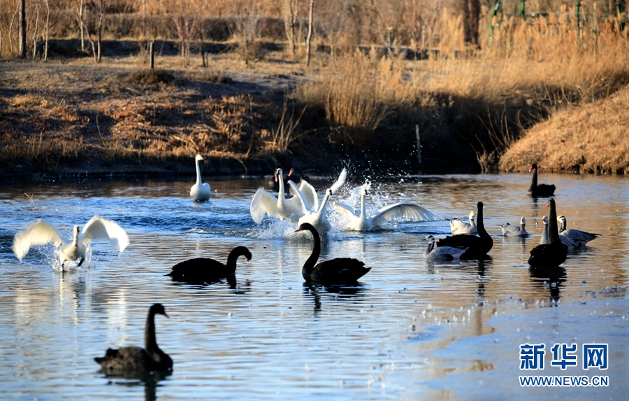 冬日清晨的甘肅省張掖國家濕地公園里碧波蕩漾,成群的白天鵝、黑天鵝等鳥類聚在一起游弋嬉戲,歡騰跳躍,成為一道亮麗的風景線,吸引眾多游客觀賞拍照。新華網發(陳禮 攝)