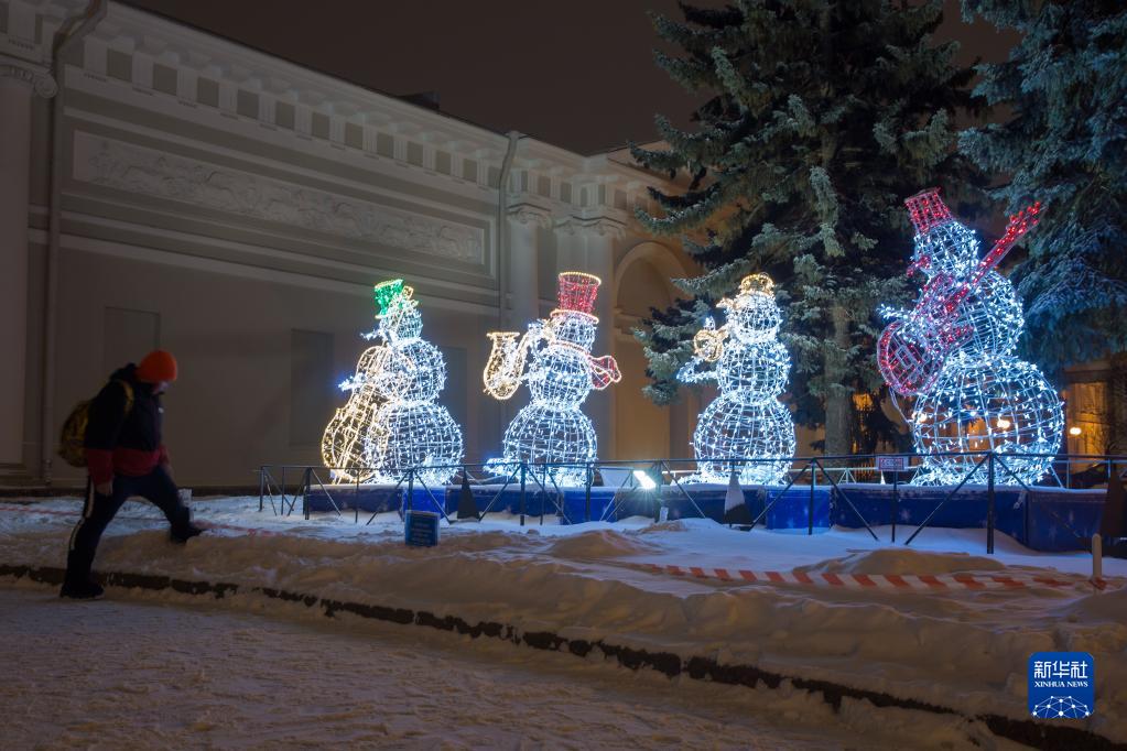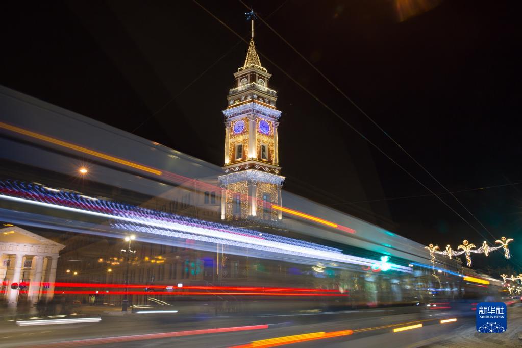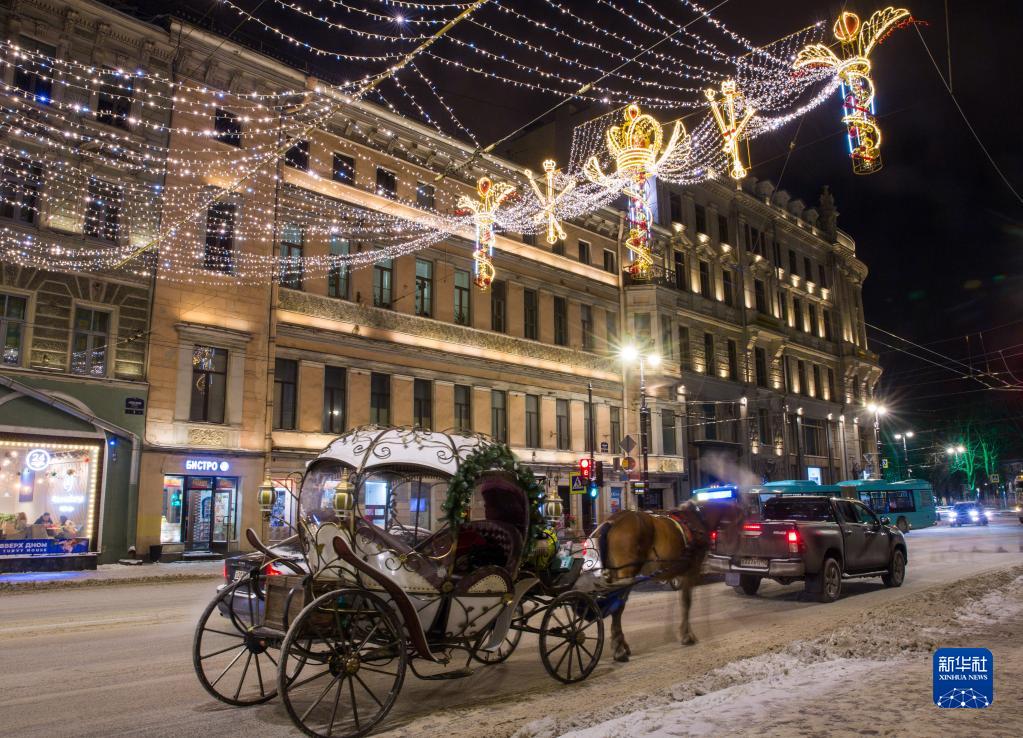 新年即將到來,俄羅斯圣彼得堡街頭點亮各色燈飾,營造節日氣氛。