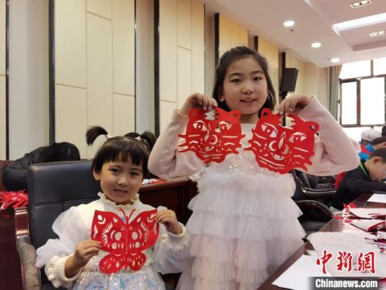 圖為蘭州孩童展示剪紙作品《小老虎》《蝴蝶》。 徐雪 攝