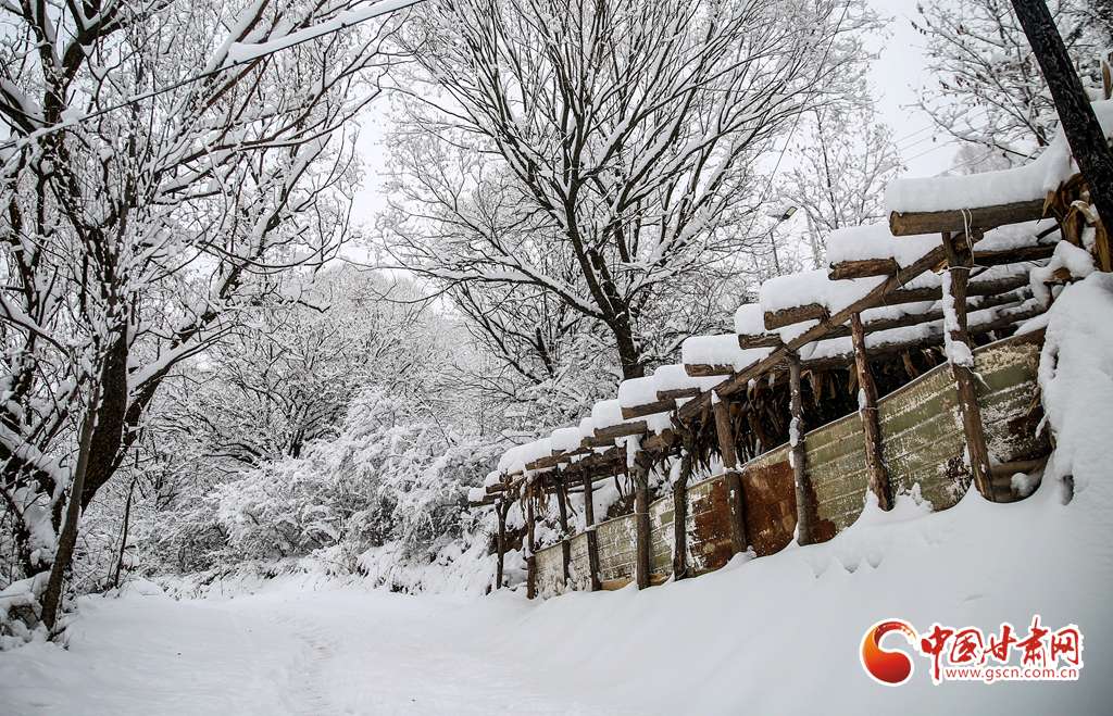 2月8日,雪過天晴,甘肅省平涼市靜寧縣賈河鄉侯山村銀裝素裹,美不勝收。果園、梯田、房屋、公路及遠山構成了一幅天然的鄉村畫卷。