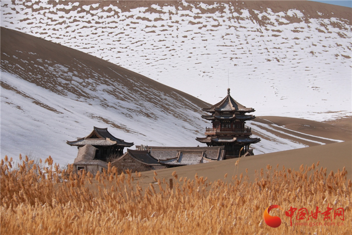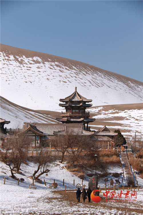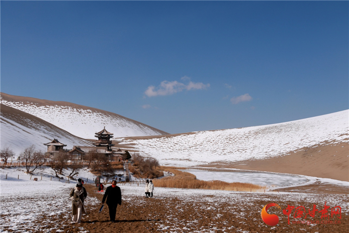 雪后的甘肅省敦煌市鳴沙山月牙泉景區景色如畫、銀裝素裹,美不勝收。