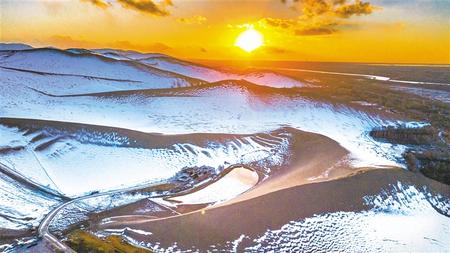 2月18日,雪后初霽。夕陽西下,敦煌鳴沙山月牙泉景區(qū)景色迷人。新甘肅·甘肅日報通訊員 王斌銀