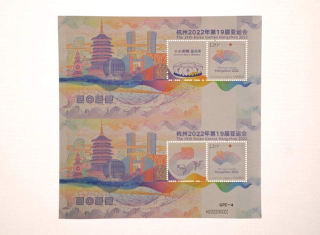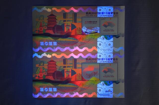 據了解,《杭州2022年第19屆亞運會》特殊版式個性化郵票雙連張是中國集郵有限公司匠心打造的首款GPZ編號體育題材郵票,由青年設計師趙郁竹擔綱設計,限量發行。它依托杭州亞運會色彩系統和視覺形象元素,融歷史文化、現代美學和未來暢想于一體,集藝術感、科技感和運動感于一身,展現中華文明、浙江風采、杭州韻味和時代魅力,采用特殊版式、編號和工藝,紫光燈下局部呈現無色熒光油墨圖案和全真彩效果,傳遞中國郵政對杭州亞運的美好祝福。(圖片由人民日報客戶端提供)
