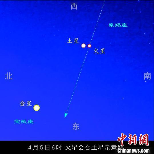 天文專家介紹稱,近日,火星和土星都位于摩羯座,火星由西向東追趕著土星。4月4日,火星將出現在土星的西南面,兩者相距0.9度;4月5日6時,火星將追上土星,二者位于同一條經線上,兩者相距0.3度。但這還不是二者最短的距離,根據理論計算,再過幾個小時,火星和土星才距離最近。圓圓的滿月的視直徑約為0.5度,如果滿月在火星和土星的前面經過,就可把它倆全部遮掩。4月6日,火星在土星東南面,兩者相距0.6度。