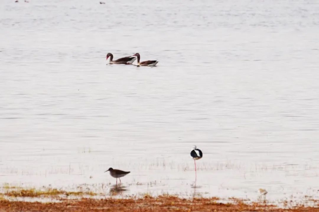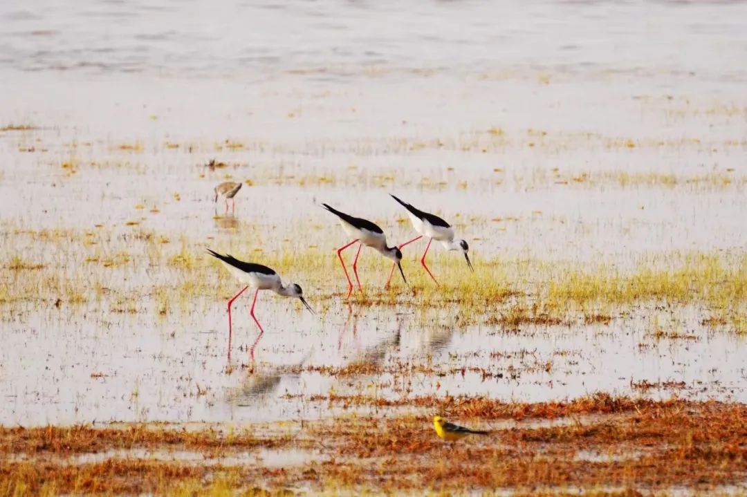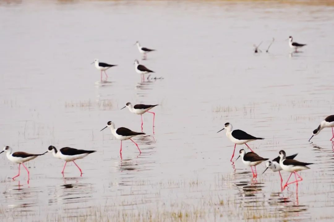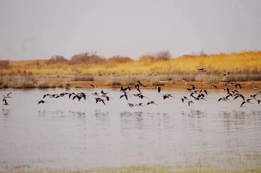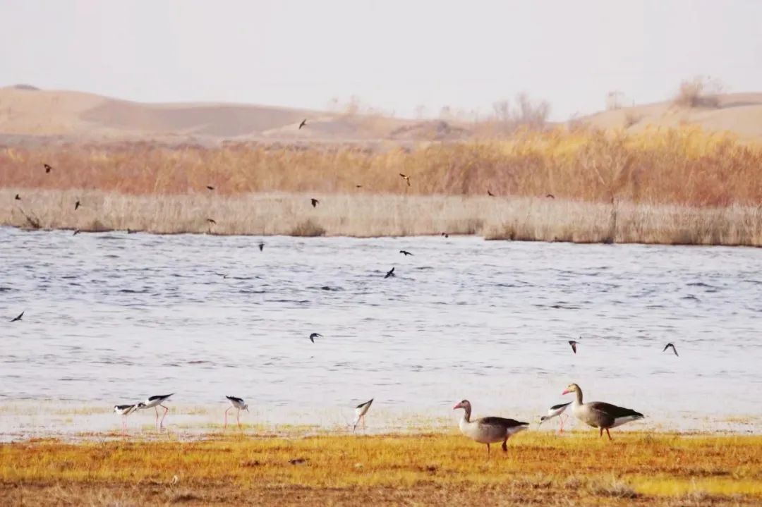 四月的敦煌大地春和景明,在庫姆塔格沙漠的邊緣,位于陽關濕地的壽昌海子波平如鏡,碧水映襯著祁連山上的雪峰,各種色彩斑斕地鳥兒仿佛收到了春天的邀約,在這里參加一場盛大的聚會。它們有的在湖面上引頸入水自在覓食,有的踏波翩翩起舞,有的追逐嬉戲鳴唱,有的在岸邊閑庭信步、悠然自得地曬太陽......構成了一幅多姿多彩的和諧自然生態畫卷。