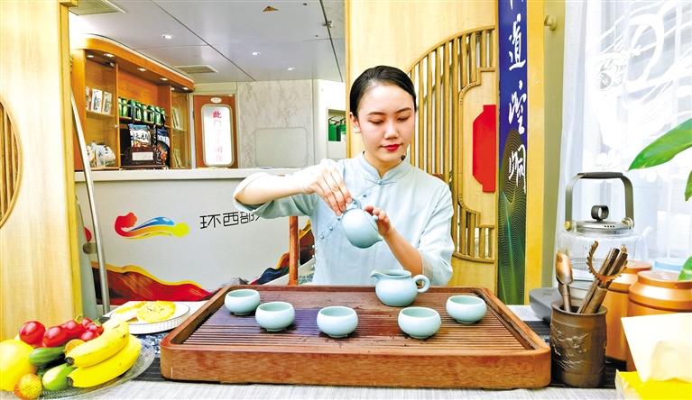 這趟列車由6節軟臥車廂、1節餐車、1節休閑娛樂功能車組成,車體內外隨處可見平涼文化旅游元素。記者在車廂內看到,崇信龍泉寺、華亭安口窯古村落、靜寧仙人峽……每一間軟臥門上都是絕美的平涼風光大片,整個車體儼然移動的“平涼文旅展館”,讓人“身未動,心已遠”。車體中部的功能車,更是顛覆了以往人們對火車的認知,麻將桌、功夫茶、全套的K歌設備,還有平涼特色文旅商品、農特產品展銷區,平涼文旅書刊閱覽區、平涼文化主題報刊欄,足以打發游客在旅途中的無聊時光。餐車也極富特色,車廂頂部裝飾有色彩豐富的藻井圖案,飛天仙子衣袂飄飄、環繞四周。“在這樣的餐車上吃飯,吃的那是品位。”一位乘客開心地和同行的伙伴說著。62歲的張女士一到平涼就忙不迭地給女兒發微信,“火車上住得舒適,服務好,環西部火車游·崆峒號很超值!”