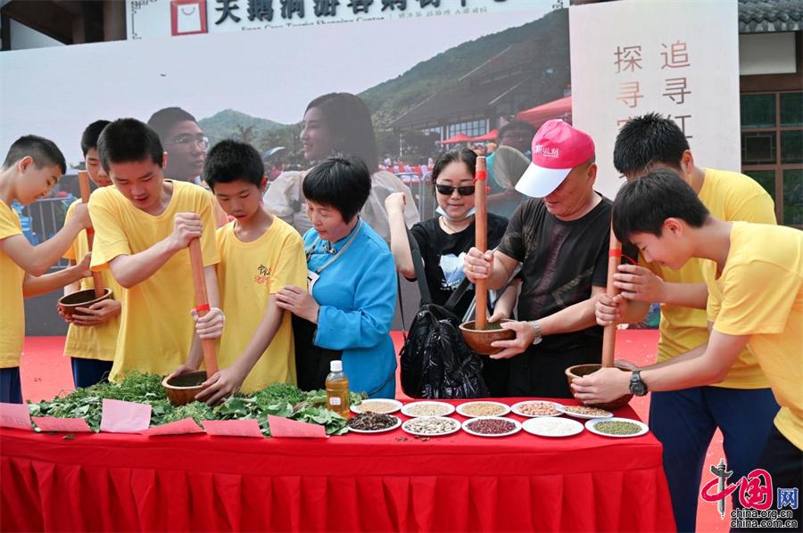 千人擂茶的場面,更是當(dāng)天的重點(diǎn)戲。游客們借助擂棍和擂缽,跟隨著非遺傳承人老師的節(jié)奏,將擂缽里的材料一一敲碎,擂出了濃郁的茶香味,也擂出了濃濃的客家情。