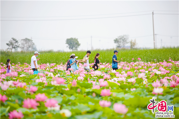 開幕式當天,雅韻風情的漢服美人,與荷花的幽香嫣然相得益彰,配著現場幾十把古箏的民樂演奏,顯得古典婉約;著一身淡雅精致的旗袍,行于生滿荷花馨香的木棧道之上,素手拂過帶著露珠的荷葉,構成了一幅天然的荷風畫卷,吸引著數十名畫家在這里揮筆創作;在荷塘深處,飛天舞者踏著碧波,乘著竹筏,在水面上翩翩起舞,這如詩如畫的表演讓游客仿佛已經分不清現實與夢幻。更有油紙傘長廊、風箏長廊、3D繪畫木棧橋、荷花主題打卡拍照墻等,讓來到這里的游客迅速進入到國風賞荷的意境中去。