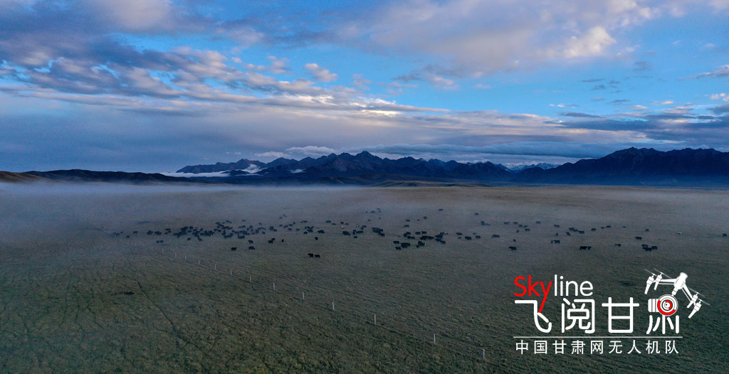 9月19日,甘肅山丹馬場雨后初霽,層層薄霧籠罩山尖,熏染了半邊天空,當?shù)谝豢|陽光劃破蒼穹,濃霧漸漸消散,頗有“風吹霧散見牛羊”的感覺。