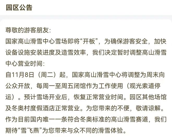 根據(jù)公告,自11月8日(周二)起,國(guó)家高山滑雪中心將調(diào)整為周末向公眾開(kāi)放,每周一至周五閉館作為工作使用(觀光索道停運(yùn))。預(yù)計(jì)雪場(chǎng)開(kāi)業(yè)后,恢復(fù)正常營(yíng)業(yè)時(shí)間。目前,“雪飛燕”已對(duì)外開(kāi)放,如果纜車開(kāi)放,便可以乘坐纜車上到山頂。