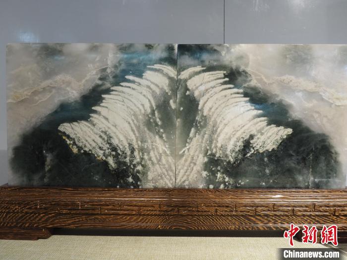 圖為現場展出的一塊奇石,其圖案有如瀑布飛流直下。李嬌陽 攝