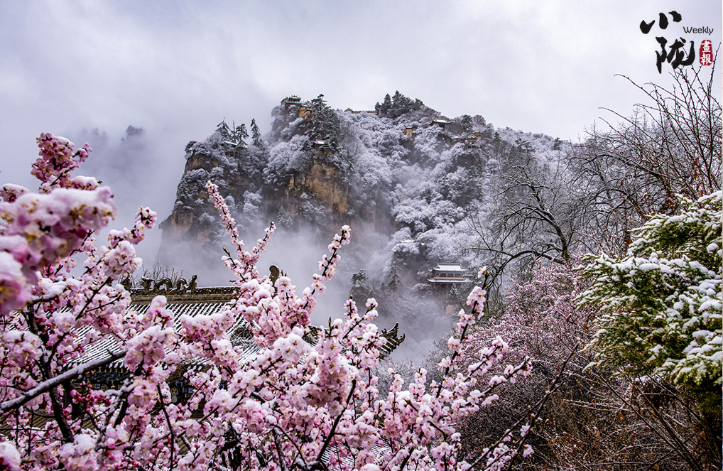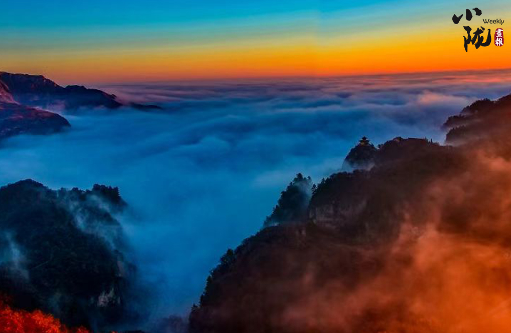 雪霽,登臨崆峒,望旭日東升,彩霞映紅山間,云霧隨風翻滾,像云彩縹緲,纏繞在山腰之間,彌漫開來,又如一條仙女的白絲帶……絢麗而有詩意。