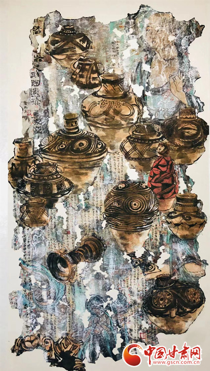 他的這幅作品《絲路遺珍-馬家窯》于2018年獲甘肅美術專業最高獎“金駝獎”,采用黃河的“s”型構圖展開,將八千年前新石器時代大地灣文化、馬家窯文化的經典代表器物分次展開。作品左上角及中間部分依次疊加,穿插,繪制中與敦煌文化中的壁畫、飛天、佛像有機結合,寓示絲路文化有序傳承、源遠流長,又對畫面的視覺撥高提升。