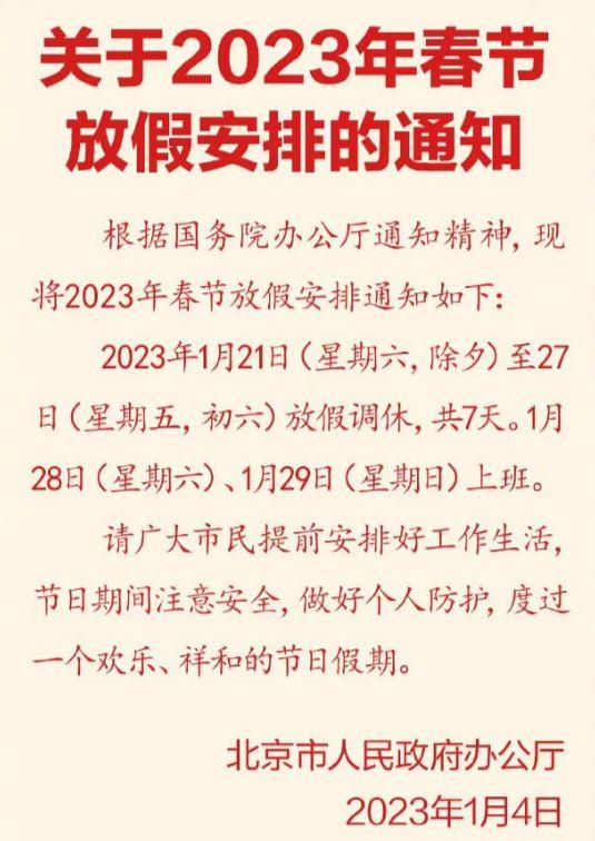 1月4日,北京市人民政府辦公廳發布《關于2023年春節放假安排的通知》(以下簡稱《通知》)。《通知》指出,根據國務院辦公廳通知精神,現將2023年春節放假安排通知如下:2023年1月21日(星期六,除夕)至27日(星期五,初六)放假調休,共7天。1月28日(星期六)、1月29日(星期日)上班。
