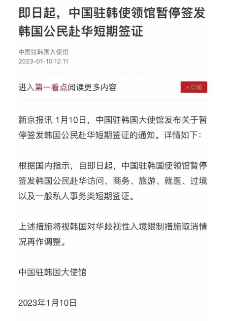 今天,中國駐韓國大使館發布《關于暫停簽發韓國公民赴華短期簽證的通知》(以下簡稱《通知》)。通知稱,根據國內指示,自即日起,中國駐韓國使領館暫停簽發韓國公民赴華訪問、商務、旅游、就醫、過境以及一般私人事務類短期簽證。