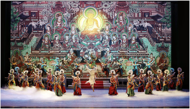 例如,僅一段英娘賣藝的舞蹈,就由100多幅敦煌壁畫中的舞姿形象編排而成,舞蹈節奏抑揚頓挫,舞姿優雅靈動;而“千手觀音”“反彈琵琶”“伎樂”“小雜耍”“黑巾舞”“霓裳羽衣舞”等舞姿,則是出自莫高窟第3窟、第112窟、第321窟、第184窟的壁畫。